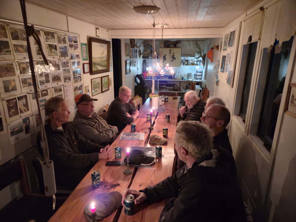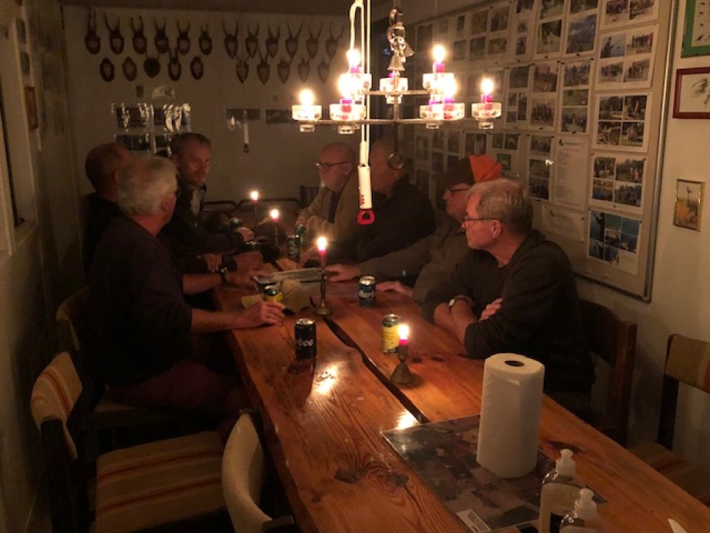 Der sluttedes af med en øl/vand i jagthytten i stearinlysenes skær. Det var en god og stemnings- fuld indledning til weekenden.