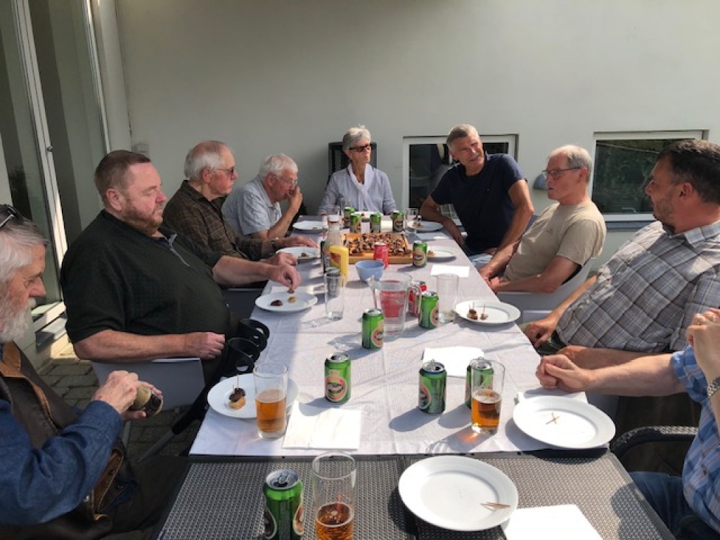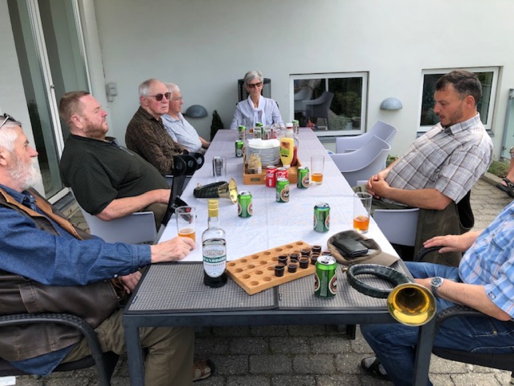 Ole Madsen svarede positivt tilbage og tilbød, at vi stedet kunne holde det lille arrange,ment på hans terrasse. Ubeskedne som vi er, sagde vi mange tak til det, og samtidig blev andre af naboerne til Skanseskoven inviteret til at deltage, så de også kunne "tage hævn over rågerne ved at spise dem" = at smage, hvor lækre grillede rpågebryster er. det blev et meget hyggeligt arrangement, hvor Ole Madsewn udover de bebudede øl også bød på en pølse efter råge- brysterne. - Voreds 3 hornblæsere "Nold", Jørgen og Hejne indledte "seancen" med signalerne "Samling", "Rågen" og "Frokostsignalet".