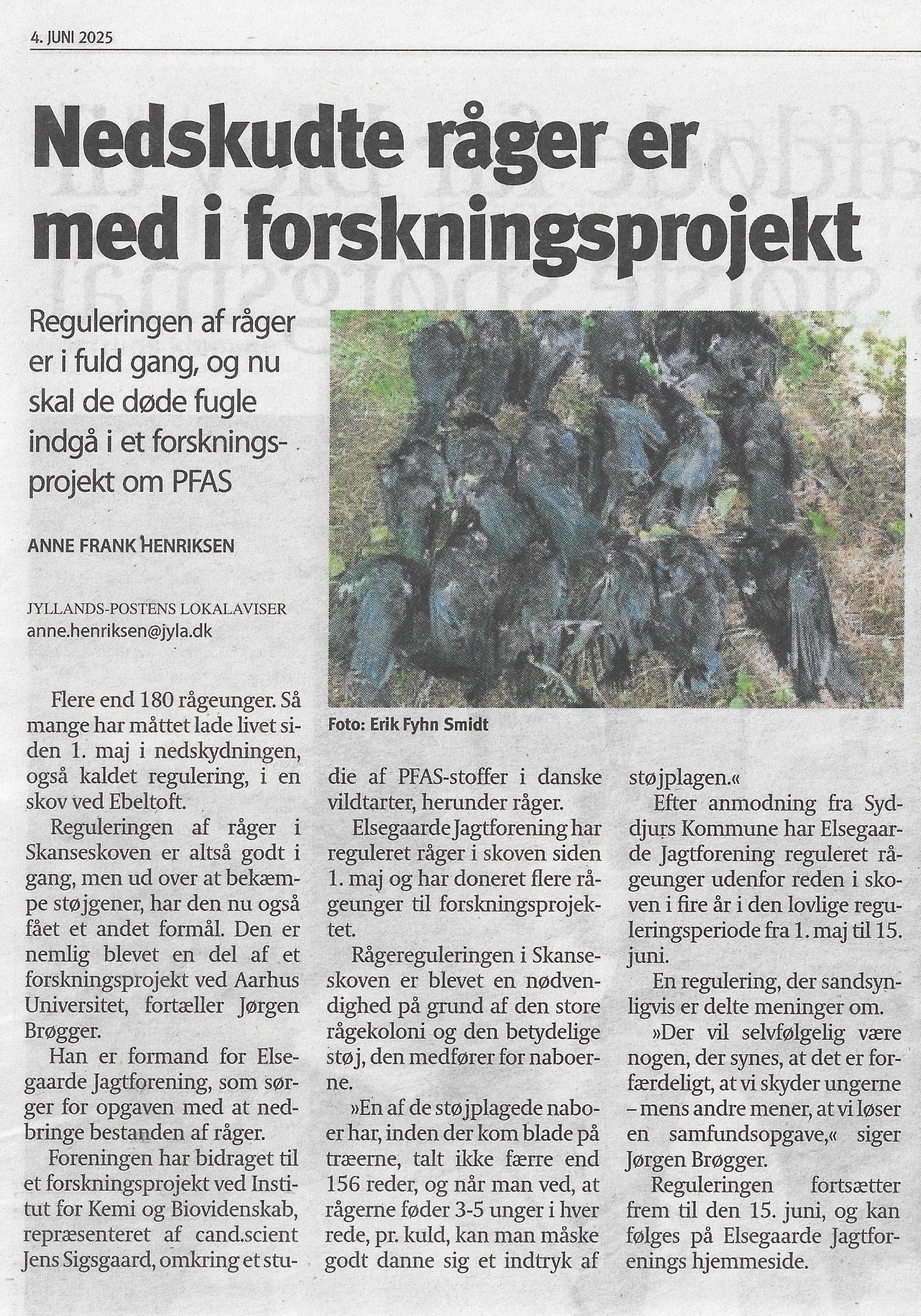Meddelelse herom er sendt til Kommunens natur- og Miljø- forvaltning for indberetning til Naturstyrelsen. Vi har, selvsagt, sagt, at vi også gerne står til rådighed næste år, - samt at der ikke kan være tvivl om, at bestanden fortsat vil vokse. - Før der kom blade på træerne, talte en af naboerne 156 reder. Med de 203 unger, vi har bortreguleret svarer det kun til knap 1½ unge pr. rede, hvilket jo ikke "batter" så meget., når rågerne føder 3-5 unger pr. kuld.