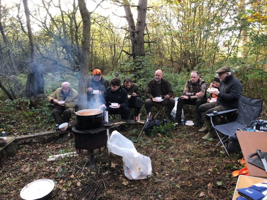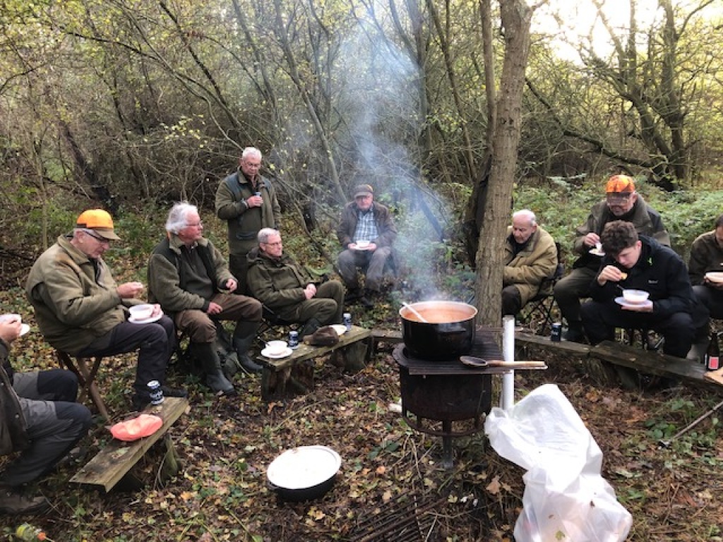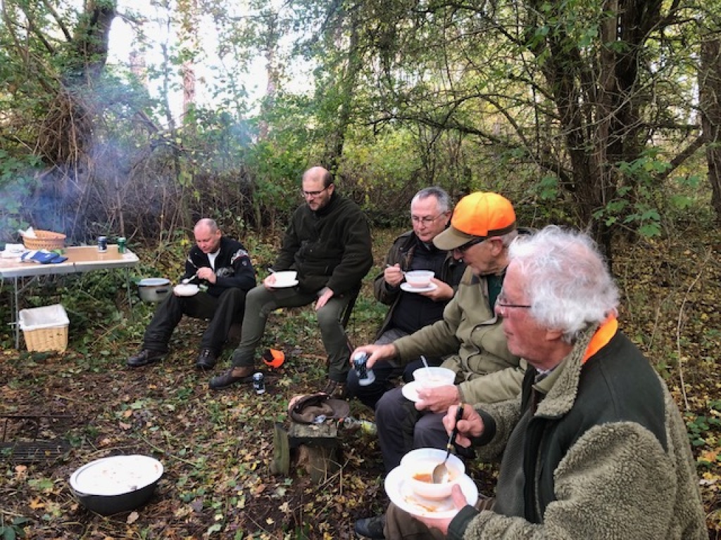 Efter jagtens afslutning samledes alle omkring bålstedet, hvor jagtværterne var værter ved en gang "Jægersuppe" efter en af Jægerforbundets opskrifter, - hvilket vakte stor lykke rundt omkring på jagtstolene.