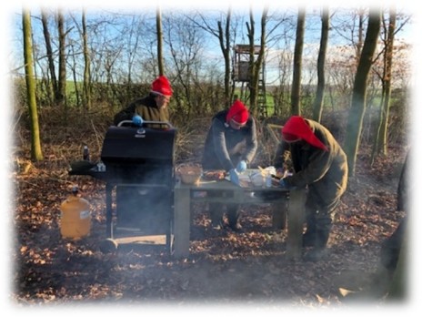 både ”Nord” og ”Syd”. Da det er en festdag, bliver der ingen ”trampejagt” denne dag. - Vi gør, som vi plejer: Korter jagten lidt af og slutter dagen af med, at foreningen i jagthytten er vært ved en gang grillede gode pølser med tilbehør samt en juleøl (også alkoholfrie) og en dram, inden vi ønsker hinanden glædelig jul.