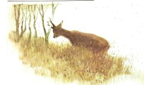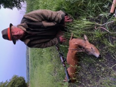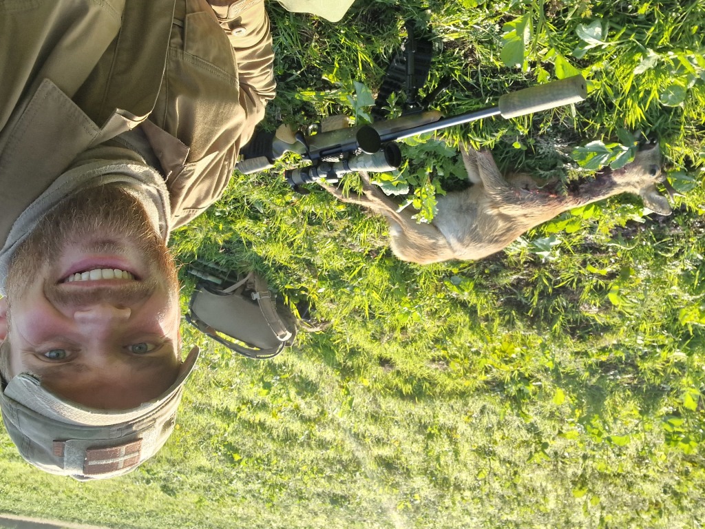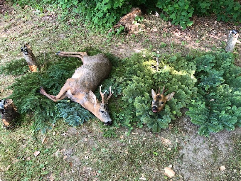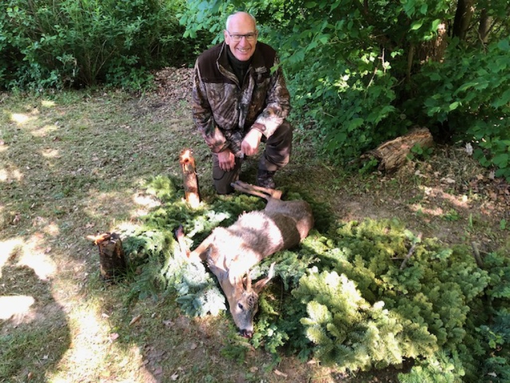 Kl. 5.15 gik der et skud måske 1 km. mod Termestrup. Jeg ventede spændt på, om det ville udløse dyr, der kom til vores eng. Og ganske rigtigt, en flot gaffelbuk kom i fuld spring tværs over vores eng ned mod åen – men ude på 175 m – så den fik lov at fortsætte ind i vores buske. Det resulterede i lidt smælen inde i pilekrattet, og kl. 6.15 kom den samme gaffelbuk ud ca. midt mellem stige 9 og 8. Jeg valgte ikke at skyde ham. Lidt senere kom der en skovmår tværs over marken, direkte til min stige, og begyndte at kravle et par trin op. Jeg jog den væk, da der ikke er plads til to ! Kl. 7.15 kommer der en rå gående ned langs pilekrattet og forsvinder stille ind i buskene. To minutter efter kommer en gaffelbuk efter den. Den er meget urolig, og da den efter måske 20 sekunder står stille, skyder jeg den. Lige i hjertet og den falder på stedet. En smuk morgen, med nattergalen syngende i 1½ time – hvad mere kan man ønske sig😊
