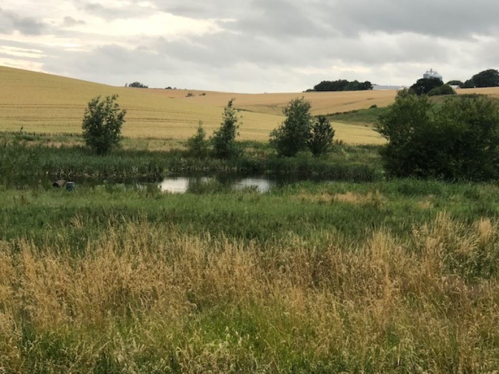 Jeg var på plads på stige 3 lidt før kl. 0500, og intet skete indtil kl. 06.45 udover en flot solopgang på det smukke natursted ved søen. Vinden var perfekt. Så pludselig kom bukken ind på arealet fra højre på den anden side af søen. Den fortsatte målbevidst mod venstre, og jeg besluttede først at forsøge skud, når den kom frem på arealet tv for søen. Den tog så ophold lidt bag nogle buske. Spændingen steg ! Så kom den frem, men så sprang/løb den flere gange rundt på arealet til venstre for søen, nærmest som i kådhed, og så stilede den mod hvedemarken, men stoppede heldigvis op et kort øjeblik, og så faldt skuddet 06.55, og han gav et spring i luften og lå så stille og død i græsset.