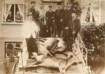 Syv af foreningens medlemmer fra de første år til parade på Ludvigsminde (nu Abildsøe) med dagens udbytte: 4 krondyr.