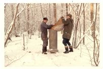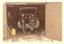 Formand Pauli Andersen (t.v.) og Klaus Bertram Mikkelsen nyder en (velfortjent?) dram efter hjemkomst fra rævejagt på Blushøj, januar 1970.