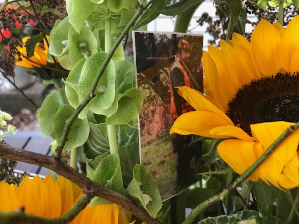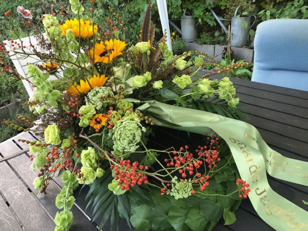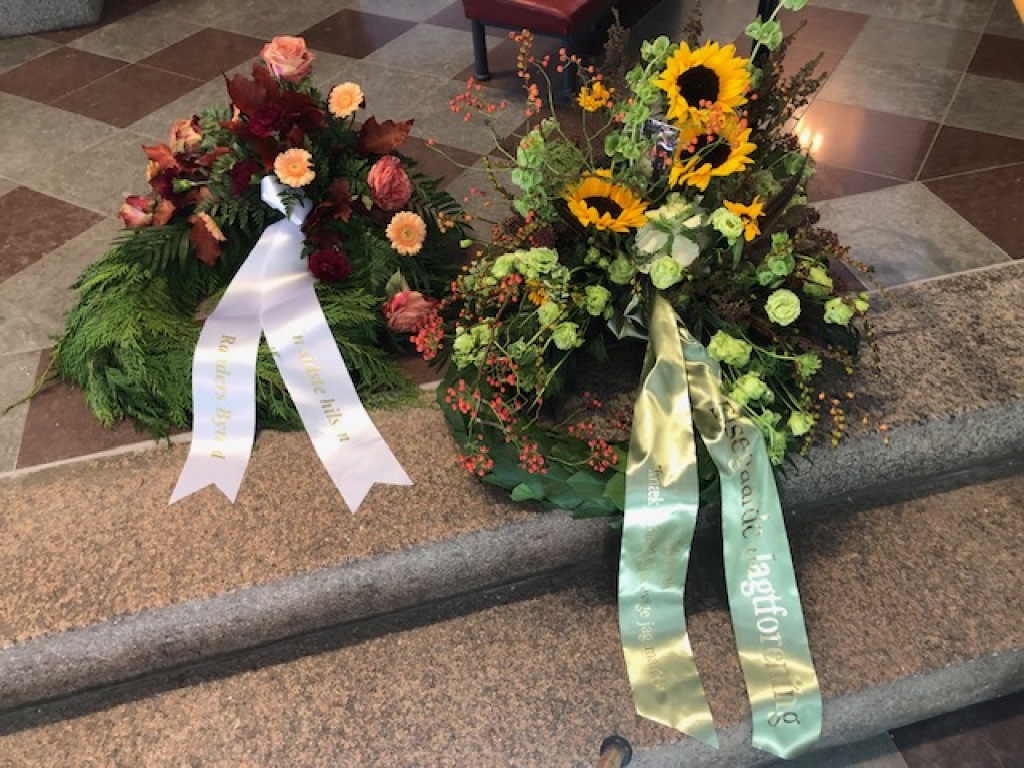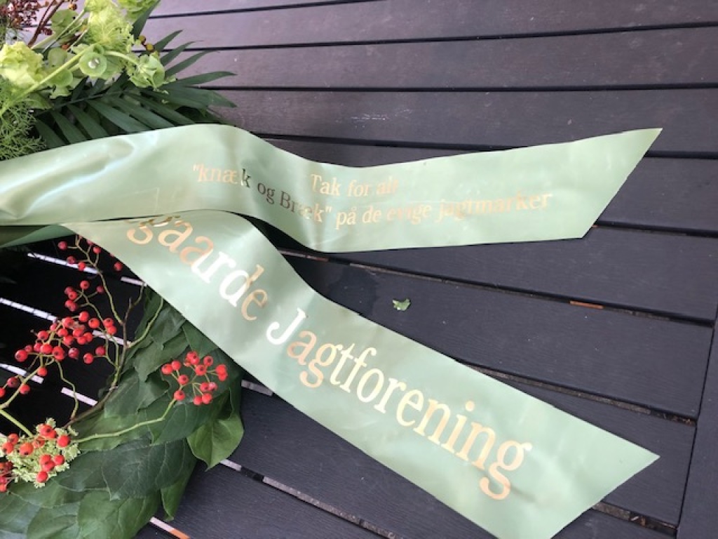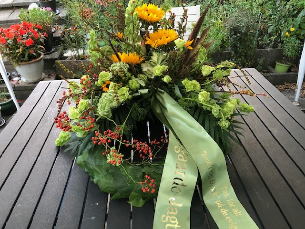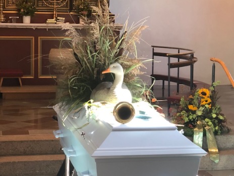 Kisten var smukt pyntet med en "naturopsats" og en grågås sammen Hejnes jagthorn. Præsten holdt en urolig smuk og meget personlig tale.