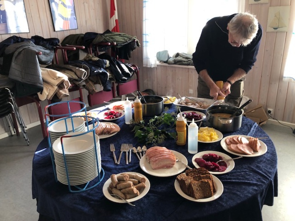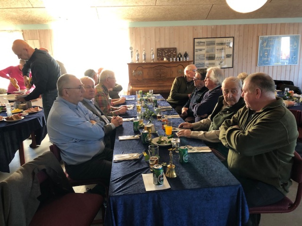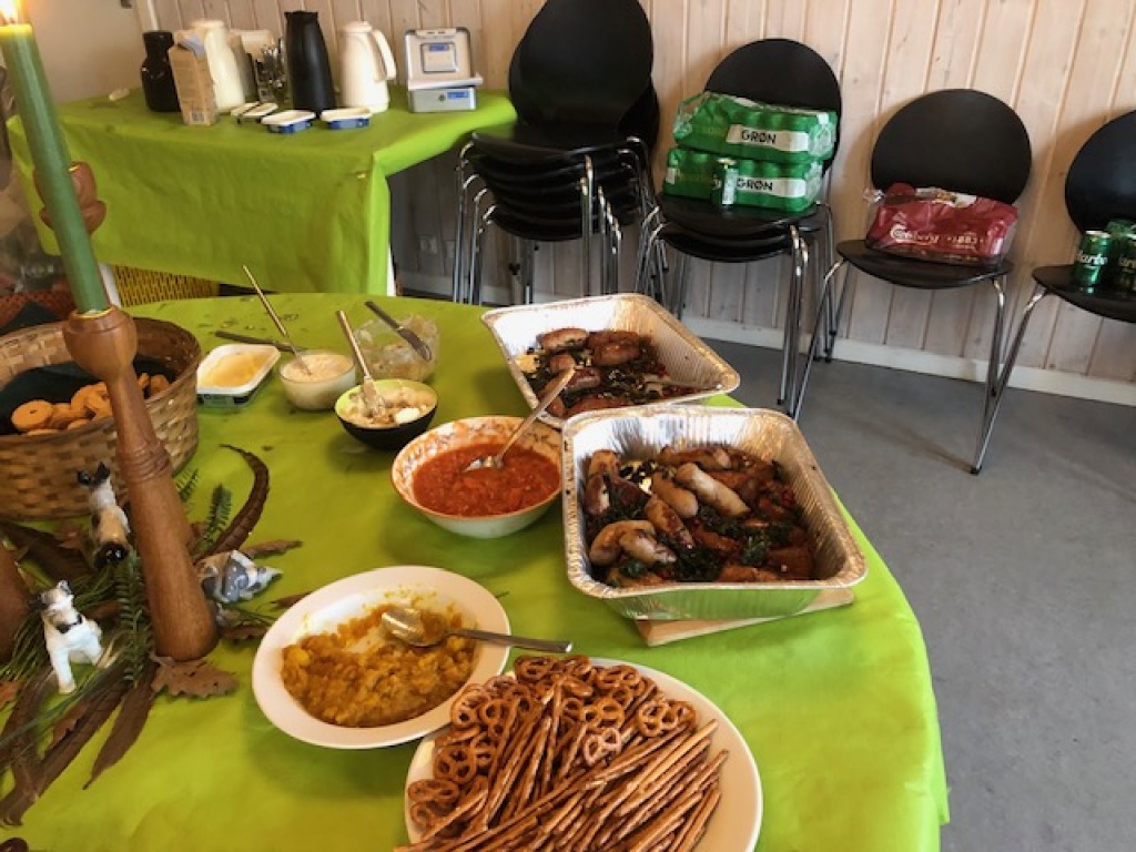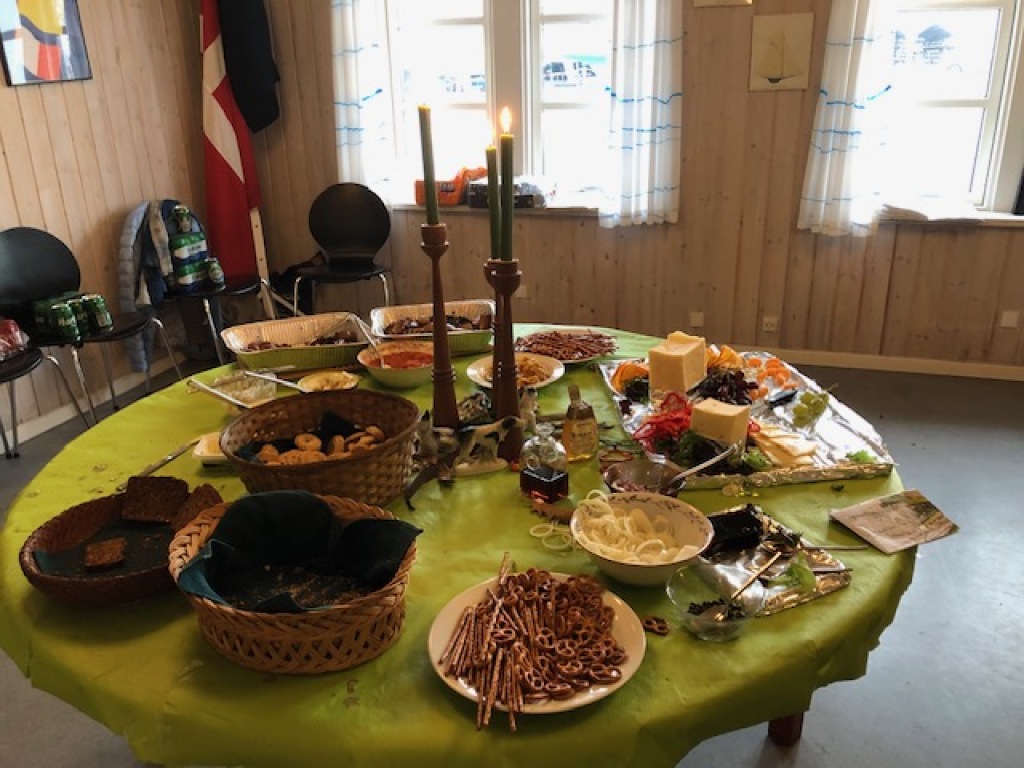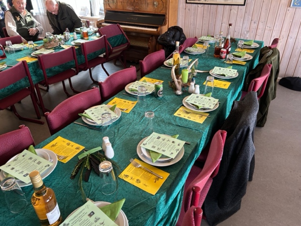Da alle havde sat sig til bords indledtes med fællessangen "Hej Jægersmand", hvorefter man "i bord-nummerorden" gik til buffet´en, der bød på: