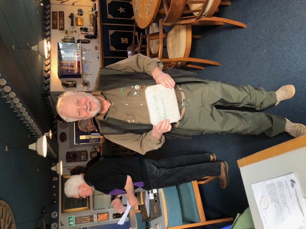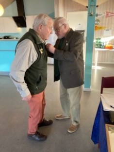 Derefter blev tidligere næstformand Ole Bisp kaldt frem, og i en meget personlig tale til ham udnævnte formanden, på vegne af en enstemmig bestyrelse, Ole Bisp til æresmedlem af Elsegaarde Jagtforening. Ole fik overrakt diplom, og formanden hæftede ærersmedlemsemblemet på brystet af OIe (se ovenstående foto). Læs talen til Ole Bisp her.