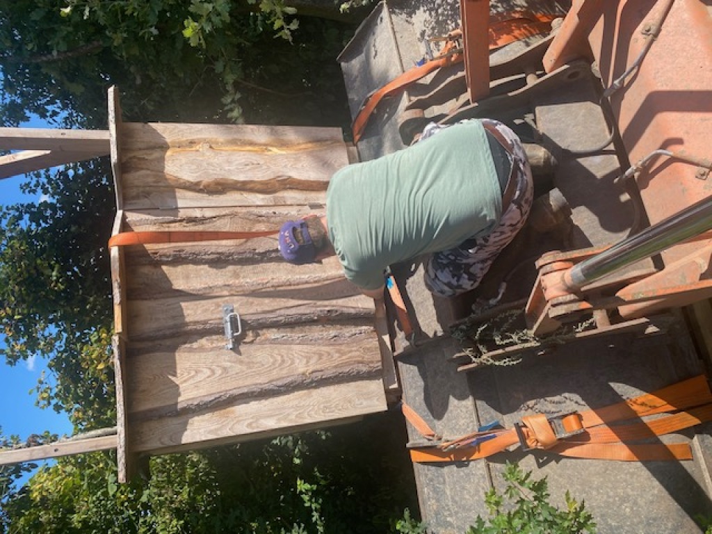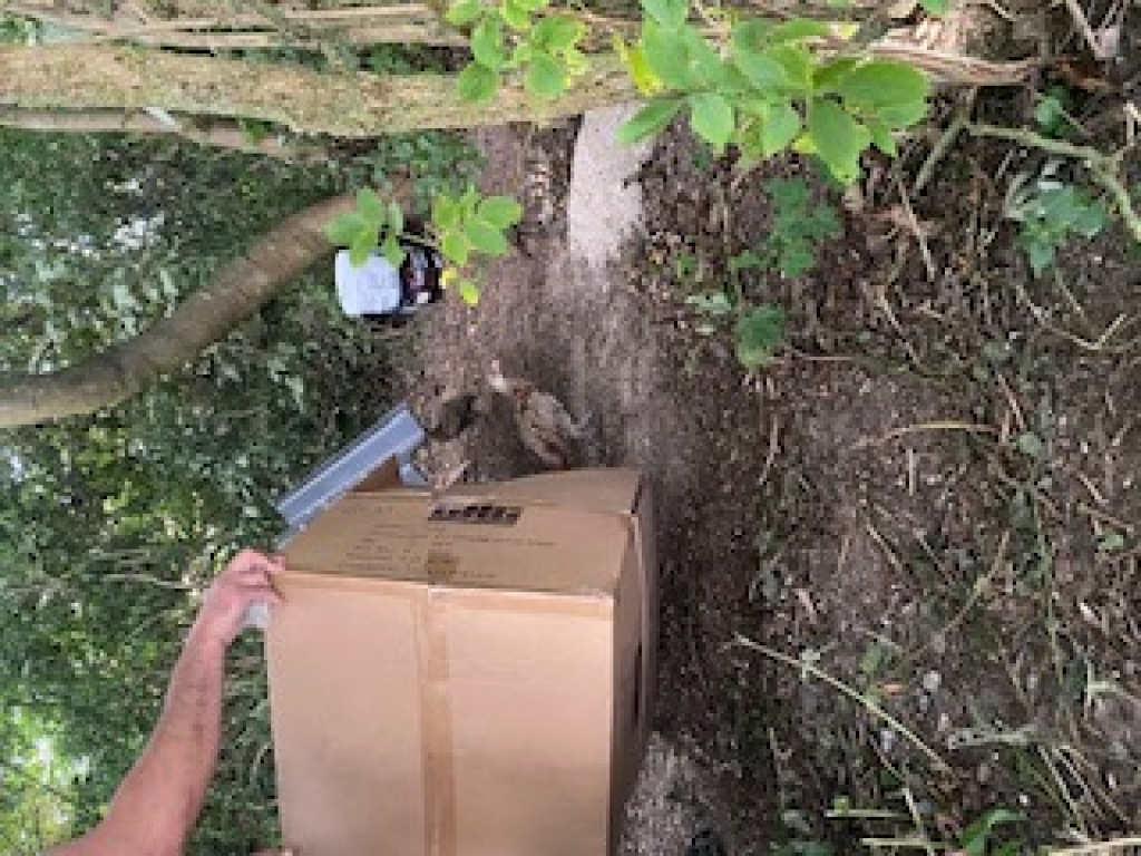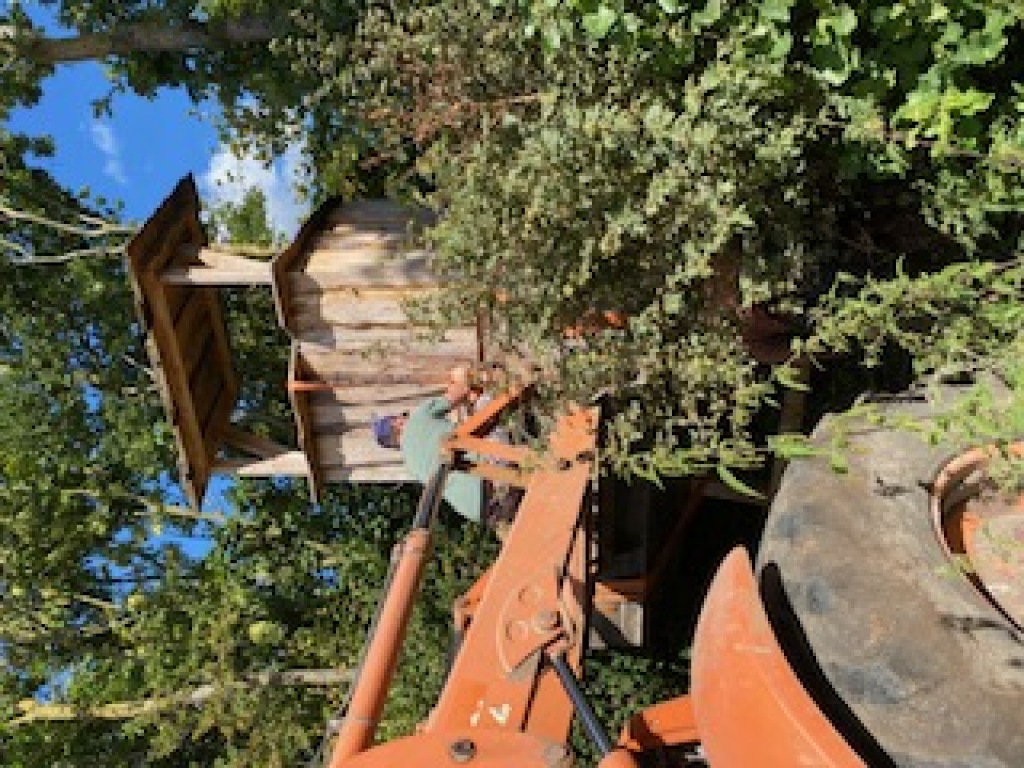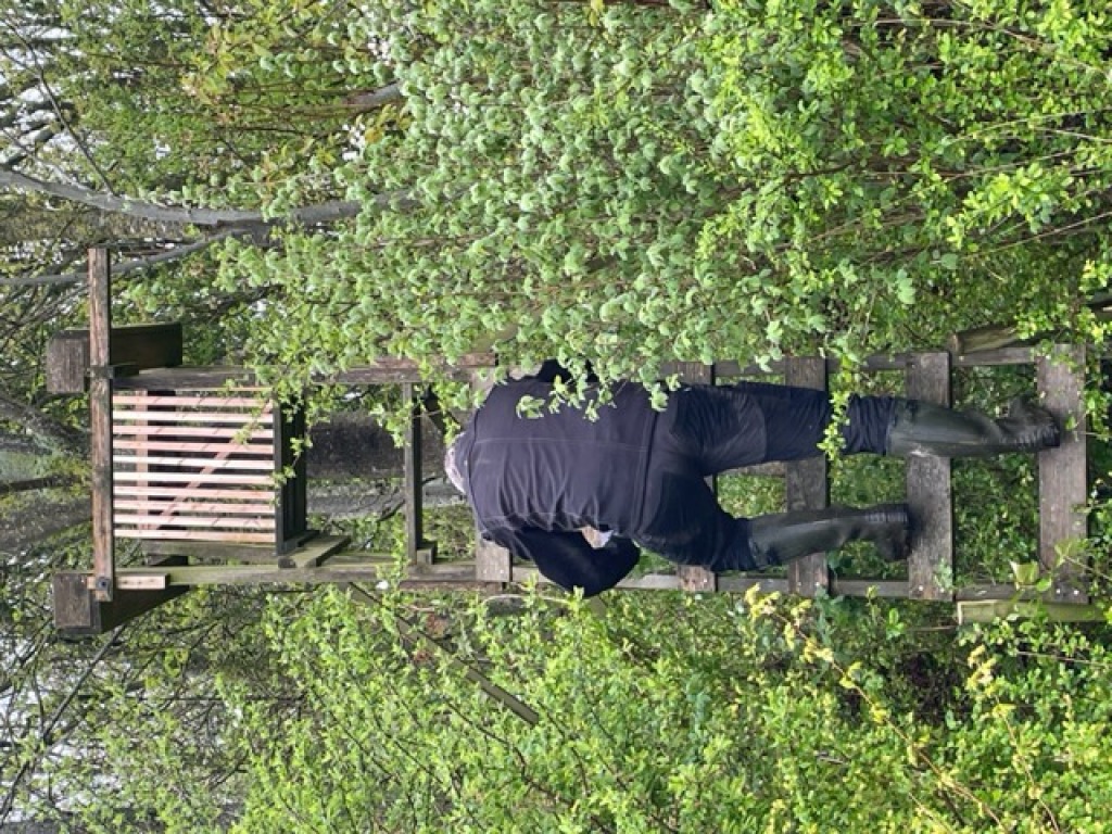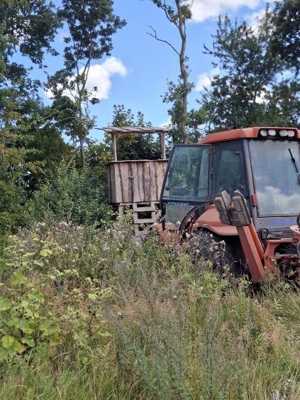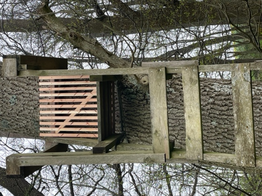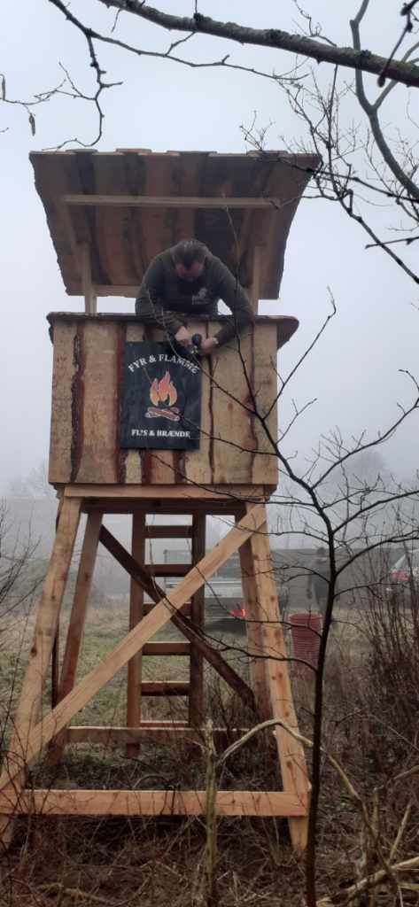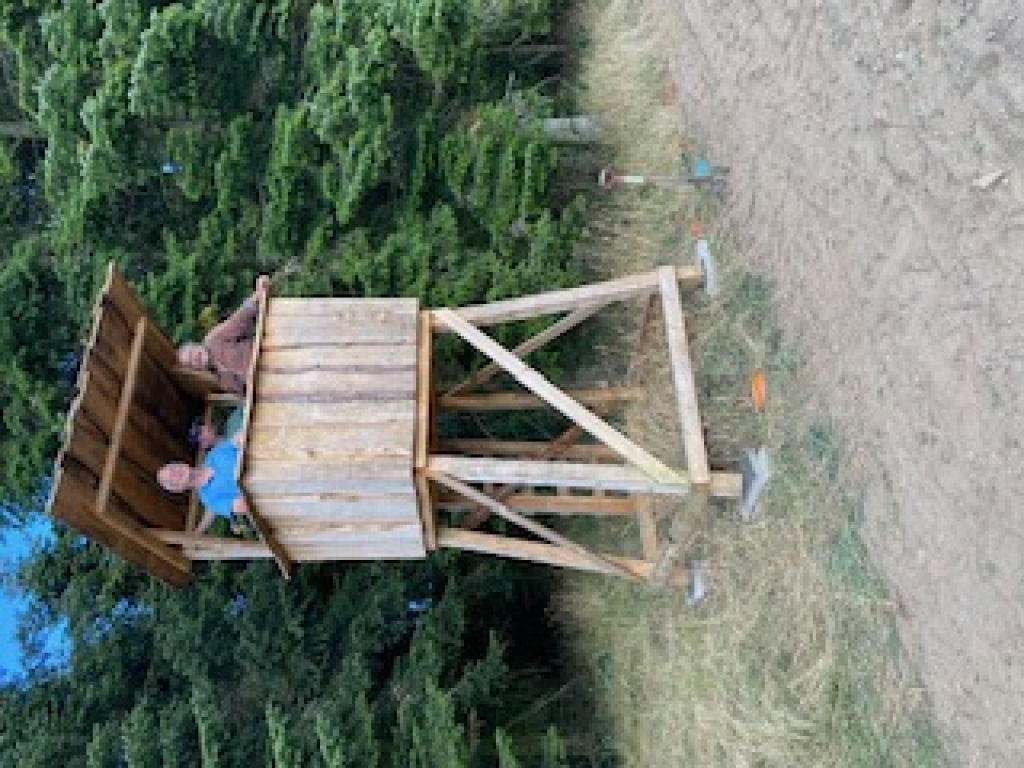 Og i dag, på "3månedersdagen" for den flugtskydning, hvor Mogens vandt tårnet, blev det så leveret og opsat. Det står nu i skovbrynet, ca. udfor gylletanken.