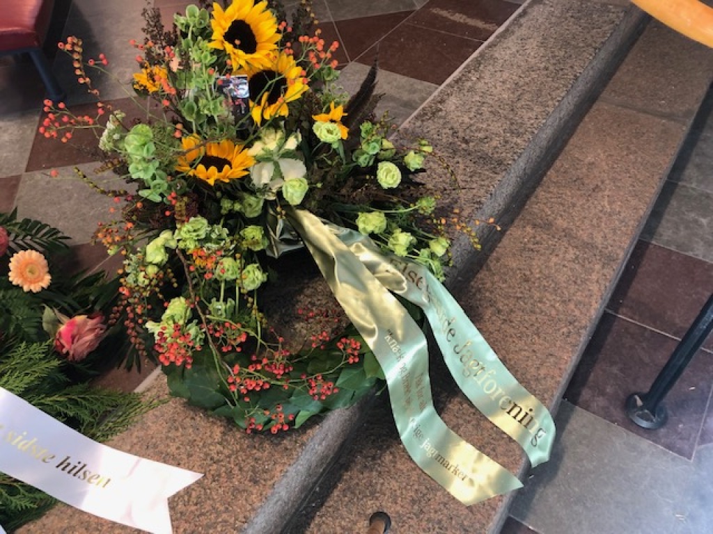 Ganske mange af foreningens medlemmer havde fundet vej til Grenaa Kirke, hvorfra bisættelsen foregik. Det samme havde selvfølgelig mange andre af Hejnes forskellige jagtvenner.