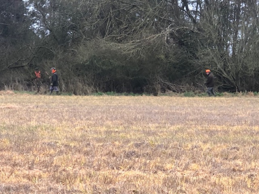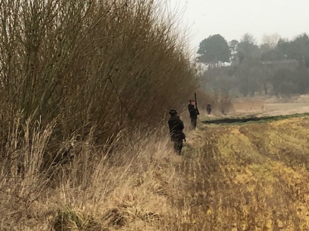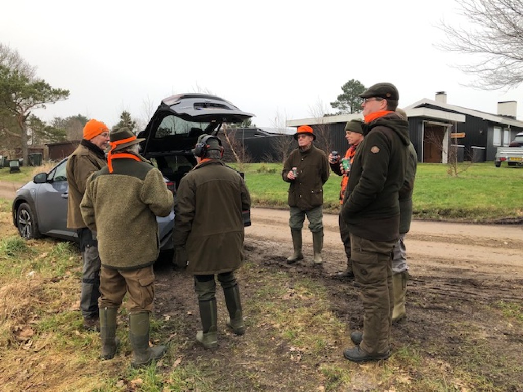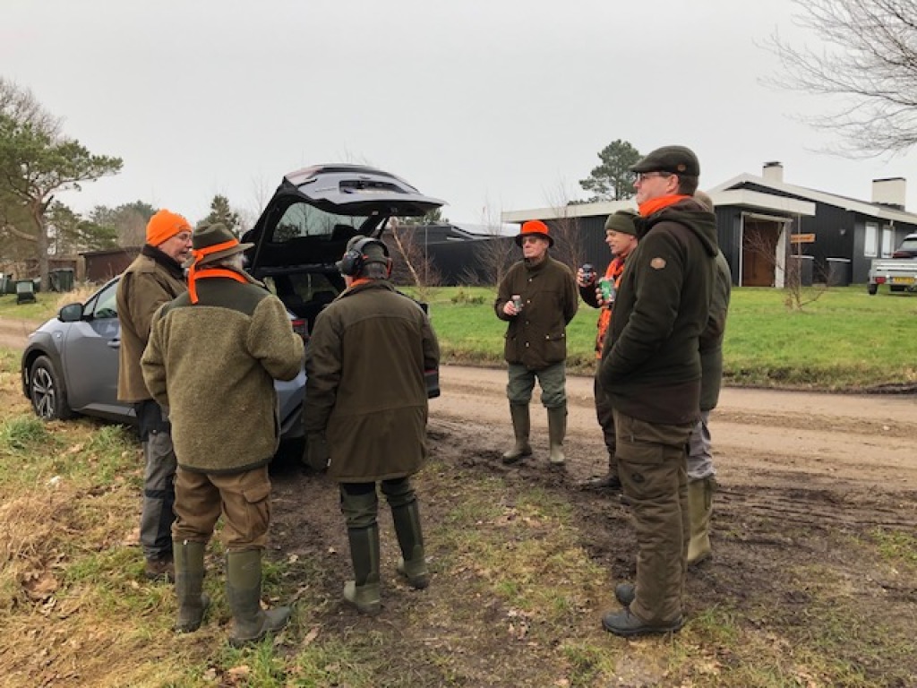 Da ganen var blevet godt vædet, tog vi til P-pladsen ved maskinhuset ved gården. Her blev vi inddelt i 4 hold.: Et, der drev det lange hegn op til søen ved stige 3 af, et andet, der dannede bagposter ved starten af samme læhegn, et, der tog i forvejen, og dannede forposter ved andesøen, og det sidste, der tog til den nye "Peters Remise". Og de fik set vildt !