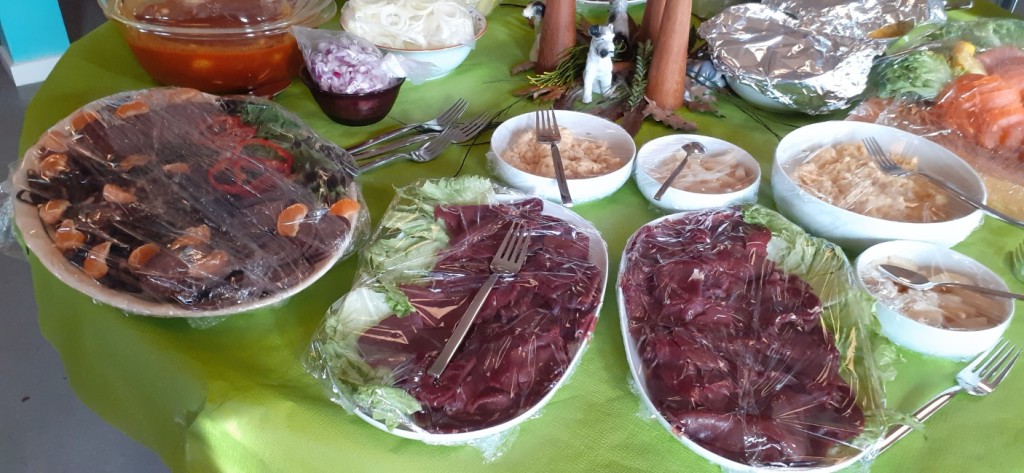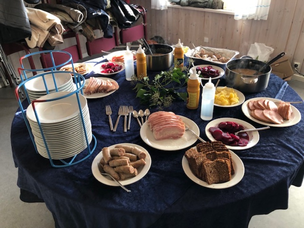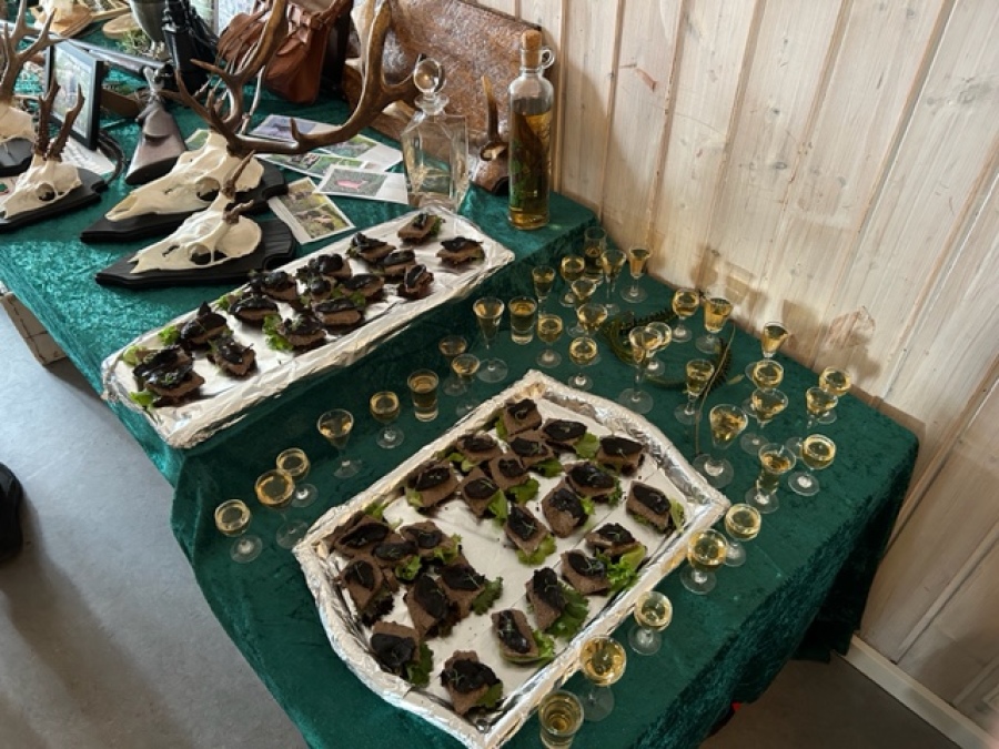 Marinerede sild med løgringe, kapers & hjemmelavet karrysalat - Stegte sild i krydret tomatsovs m. hakket rødløg - Hjemmelavet æble-/løgkrydderfedt (specielt til silden) - Hjemmerøget, koldrøget laks med røræg og/eller flødebeberrod - røget dyrekølle med røræg og/eller flødebeberrod - Stegt fasan-medisterpølse på bund af honningristet grønkål og serveret med tomatrelish - Dyreleverpostej med rødbeder - "mere af" den Grågåse-paté, der var anvendt til "appetitvækkeren" - Vildsvine-spegepølse med hjemmelavet æblechutney og friterede løgringe - 3 slags ost (alm. skæreost, god blåskimmelost & stærk ost med sky, løgringe og romstænk) - og det efterfulgt af kaffe og småkager.