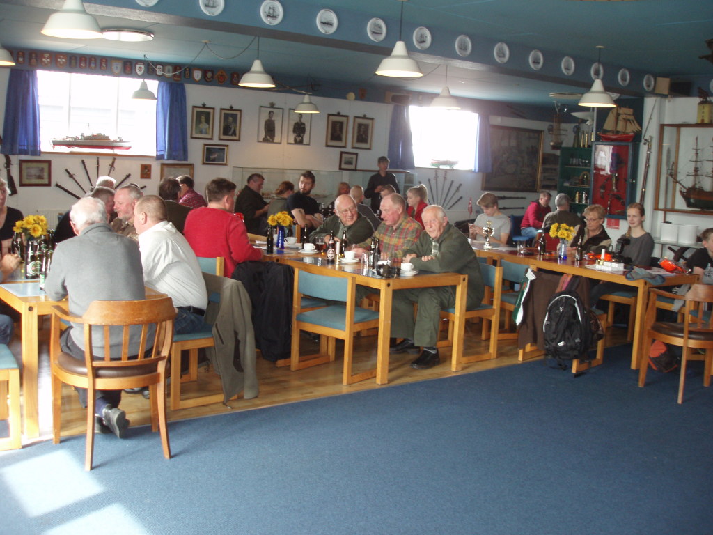 Da der var gået lidt opløsning i følget, samlede vi alle medlemmerne fra Elsegaarde Jagtforening samt Hinnerup-blæserne og gik over på restauranten overfor kirken, hvor foreningen var været ved "gravøl" - øl/vand/kaffe, hvad hver især nu helst ville have.