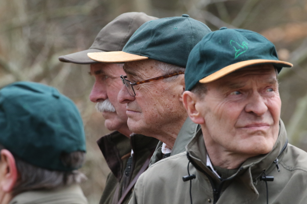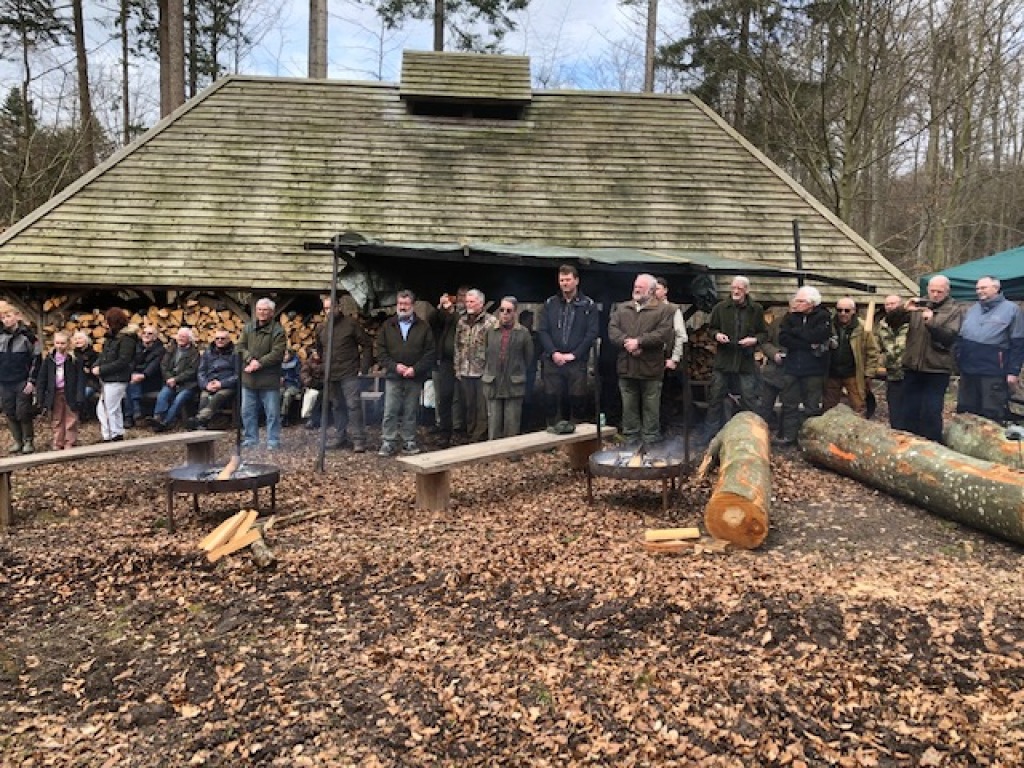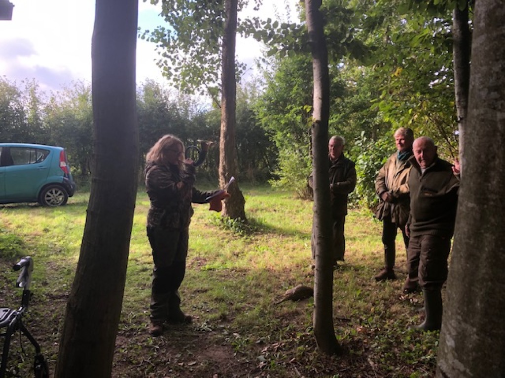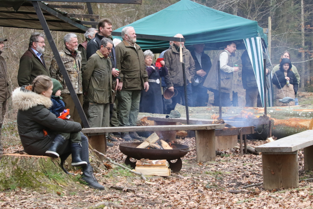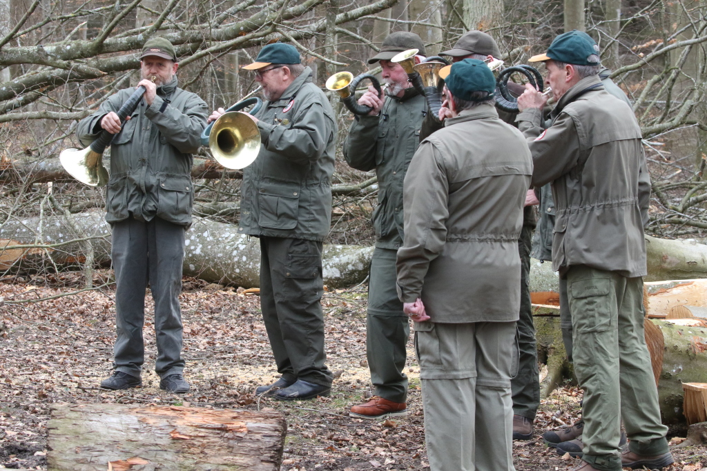 Inden formand Jørgen Brøgger besteg den træstub, der udgjorde det for dagens "talerstol", blæste Ebeltoft Jagthornsblæsere til samling, efterfulgt af jagt-velkomstsignalet "Begrüssung".