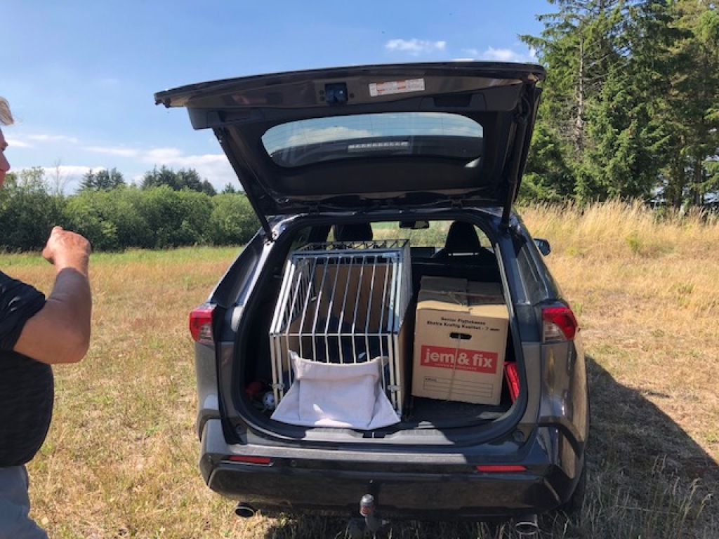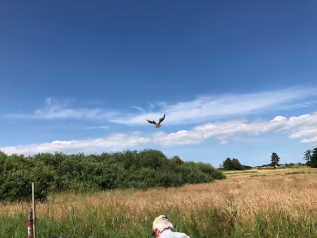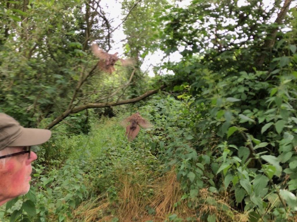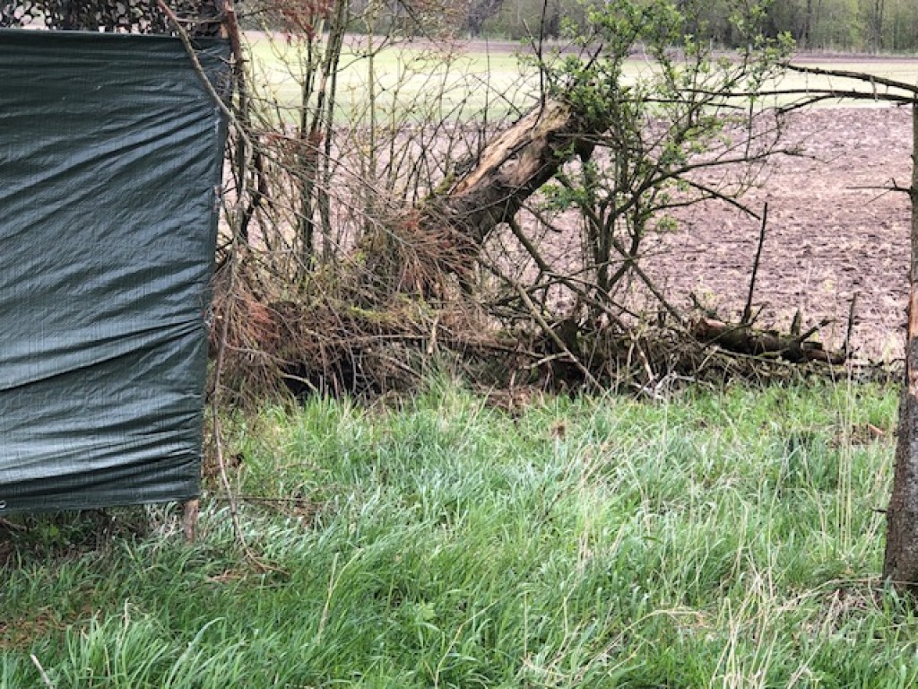 Han virker først interesseret men snuser lige færdig efter en mus han var igang med at fange. Herefter går han i en bue hen mod mig - også han vil gerne have vinden mod sig. Hans rute gør at han forsvinder bag træerne. Jeg sidder bom stille bortset fra at jeg blæser lidt mere i kaldet. Jeg synes jeg kan høre ham inde i hegnet. Så forsvinder lydene igen.