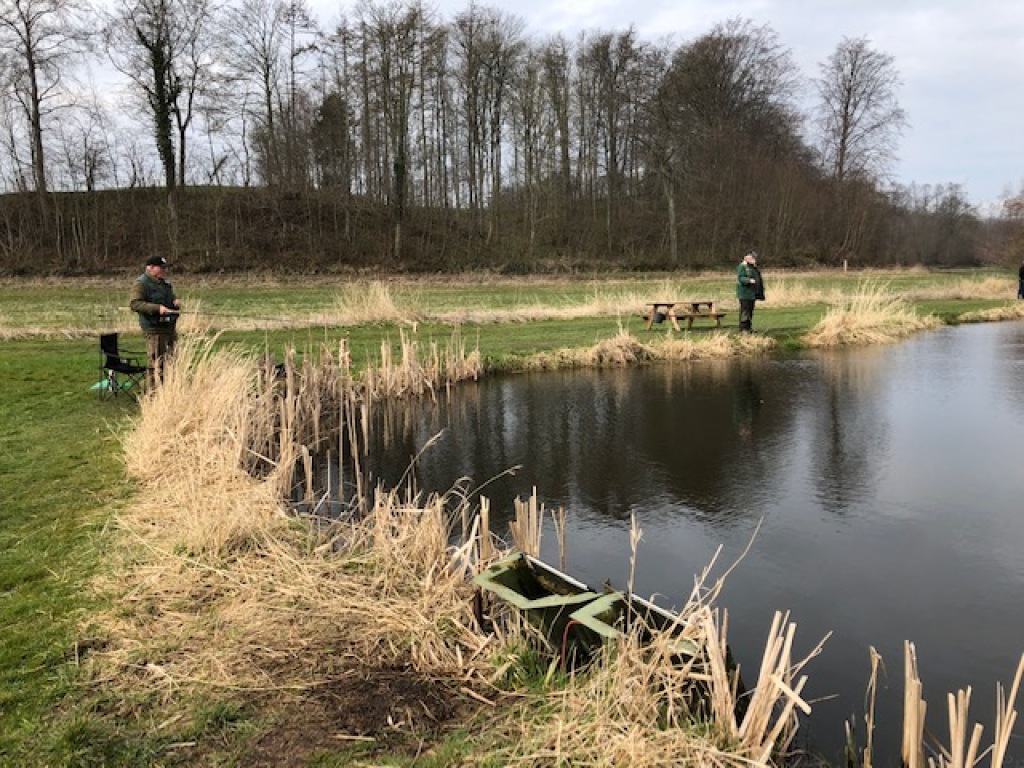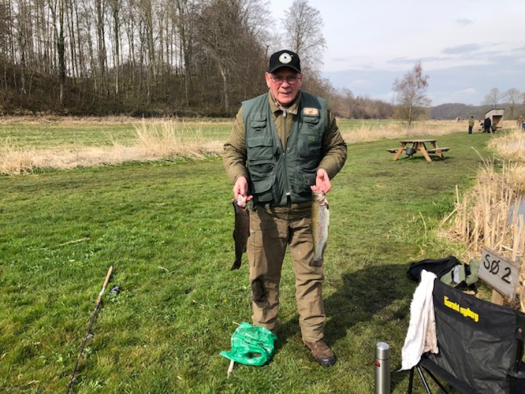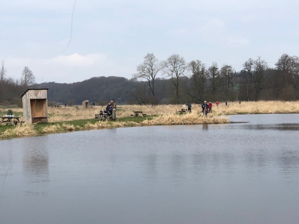 Ikke færre end 24 aktivt fiskende plus 5 ikke-fiskende familiemedlemmer mødte op til dagens familie-fisketur på Djurs Fiskepark. Modsat af, hvad vejrudsigten havde "truet med", var det tørvejr fra morgenstuen den og efter en times tid brød solen igennem, og det blev det skønneste forårsvejr. Alle nød det i fulde drag, - iogså selv om det var noget magert med fiskenes bide-villighed. Det startede llers så godt. Christian Koudal var første mand, der efter "parolen" nåede søbredden, og var dermed også den første til at få krogen i vandet. Og haps ! Hug i første kast ! Og derefter var det meget trægt. Fisk var der "nok af", vi kunne tydeligt se dem, og flere gange fulgte de efter spinnere helt ind til kanten, men bide på, ville de ikke. Christian var den eneste, der havde lykken med sig. Efter ca. en times tids længere fiskeri, fik han endnu et hu og hev endnu en opæn ørred på land. Han fiskede med regnorm. Det var der også andre, der gjorde, men uden samme held.Efter yderligere en times tid, skifte Christian til spinner, og igen var der fan gst i første kast. Han havde bid yderligere 3 gange, men alle tre gange sprang fisken af, da han forsøgte at lande den.