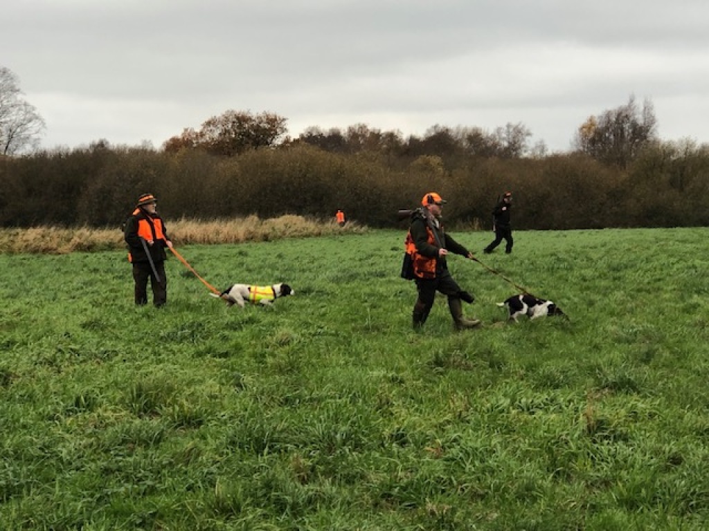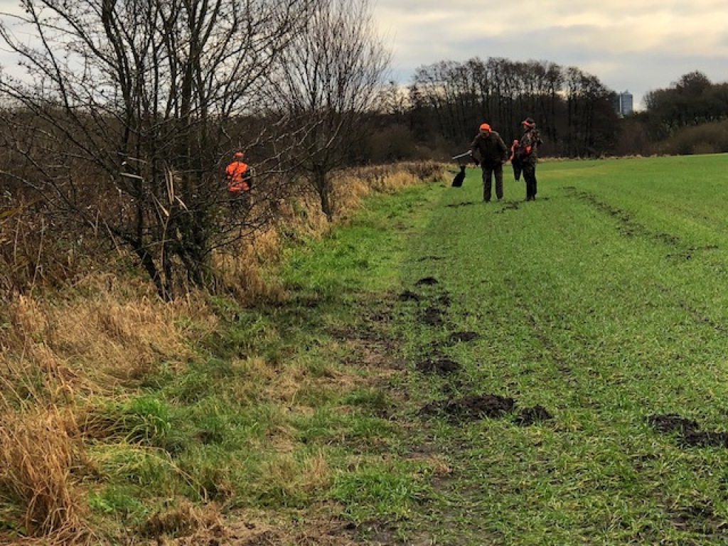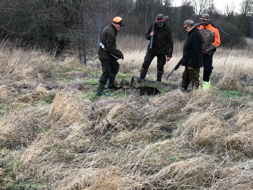 I forsøget på at få reduceret rævebestanden på foreningsreviret havde vi, ved mellemkomst af vores gode medlem, Thorlaif, allieret os med de to inkarnerede og meget erfarne gravjægere Knuid og Ole fra Grenaa. Yderligere deltog her fra foreningen Hejne, Arjan, Michael, Alvaar og Jørgen. Vi førsøgte ved alle gravene på "Syd". Efter en kort "parole" ved "laden", hvor Jørgen udpegede, hvor de forskellige ligger og Knud havde havde givet diverse "dessiner", startede vi med kunstgraven i fremisen ved stige 7. Desværre "var ingen hjemme" her. Det samme var tilfældet med naturgraven midt på marken mellem stige 8 og søen. Forventningerne var store, da skulle "prøve kræfter" med det store natur-gravkompleks i remisen nord for søen. Knud kunne imidlertid hurtigt se på hunden , at det var grævlinge, derr befandt sig i komplekset, hvorfor hunden ikke gik derned. Sidste forsøg var de to et-rørs naturgrave i skellet/diget mod naboreviret. Desværre heller ingen "hjemme" her. Mens vi indtog vores kaffe og madpakker io jagthytten tilbød Alvaar, at vi kunne fortsætte til hans revir ved Sjellebro.Hvilket vi selvfølgelig ikke lod os sige to gange. Alvaars revi dér er et "sumpet" moseområde, med tæt pilebevoksning m.m.. Alvaar foreslog, at vi startede med at drive området af på "almindelig vis", hvilket kunne lade sig gøre, da Thorlaif havde sin ruhår med i bilen. Knud bruger kun sin gravhund til gravjagt og intet andet, så den blev i bilen, mens vi brugte en times tid på at drive stykket af. Der måtte her skydes ræv, mårhund, fasankok og sneppe. Og resultatet blev en enkelt kok, nedlagt af Michael. Det vil sige, han anskød den pgl. kok, hvilket imidlertid gjorde, at vi blev vidner til noget af det flotteste hundearbejde nogen af os nogensinde har set : Den anskudte kok fløj 200-300 m videre og landede ifølge Knud på den anden side af åen. Knud anviste stedet hvor kokken var landet. Der forestod således en rigtig vanskelig apporteringsopgave. Åen var på stedet omkring 4 m. bred og havde en kraftig strøm og vel en temperatur på omkring 6 grader.