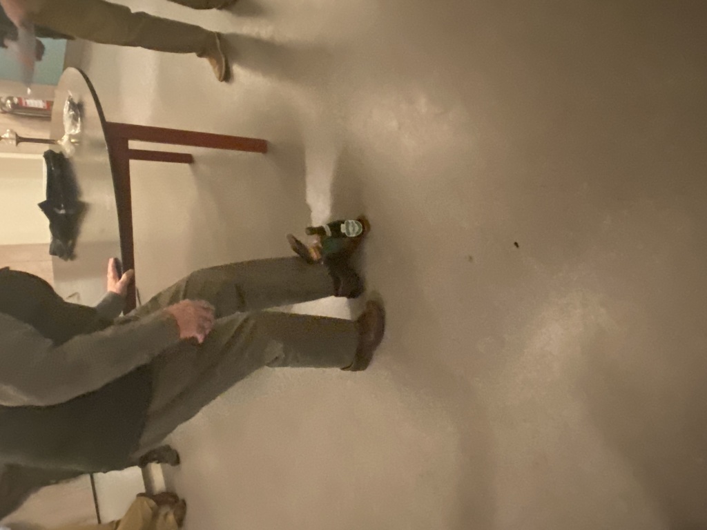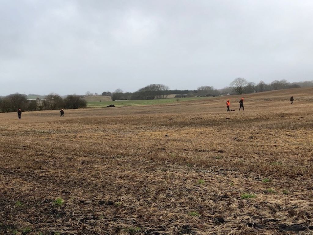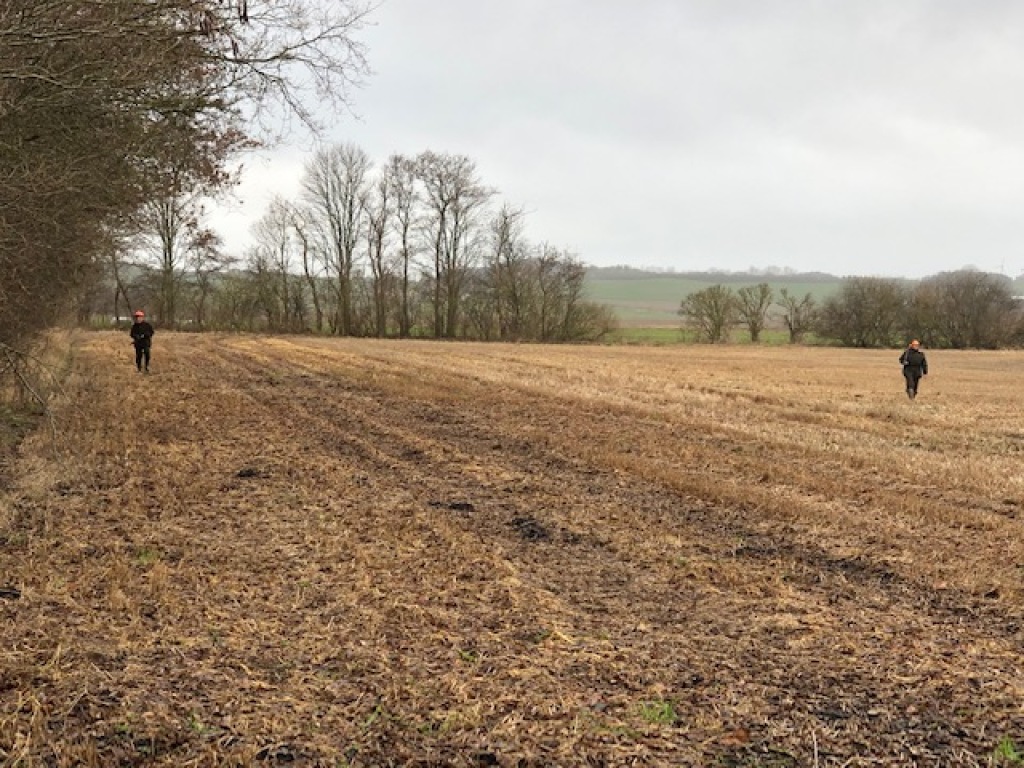 Da bukken var hentet og brækket, holdt vi en læskepause, inden vi tog "firkanten" som dagens sidste såt. Her blev Henrik, der er dårligt gående, sat på en "strategisk bagpost", hvilket skulle vise sig at være en god placering. Da "kæden" drev fremad i østsiden af marken, lettede der en hare, der bagud ned til Henrik, der dog "nøjedes med" at sende to "salutskud" efter den. Dermed forsvandt muligheden for at få en "sidste øjebliks hare" inden fredningen på søndag jo nok. Efter en kort hyggesnak ved bilerne kørte vi hver for sig hjem til "mor og kakkelovnen".