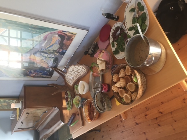 Marinerede sild m. løgringe og karrysalat - Hjemmelavet æble-/løg-krydderfedt - Stegte sild (dog ikke vårsild fra randers Fjord) i krydret tomatsauce - Hjemmerøget (koldrøget) laks m. "rævesauce", røræg & asparges - Røget dyrekølle med røræg, asparges & flødepeberrod - Tarteletter med fasan & skocsvampe - Carpaccio af dyreryg, Dyreleverpostej m. syltede rødbeder - Hjortespegepølse med rødløgsringe - 2 slags ost m. sky, løgringe & rom-stænk.