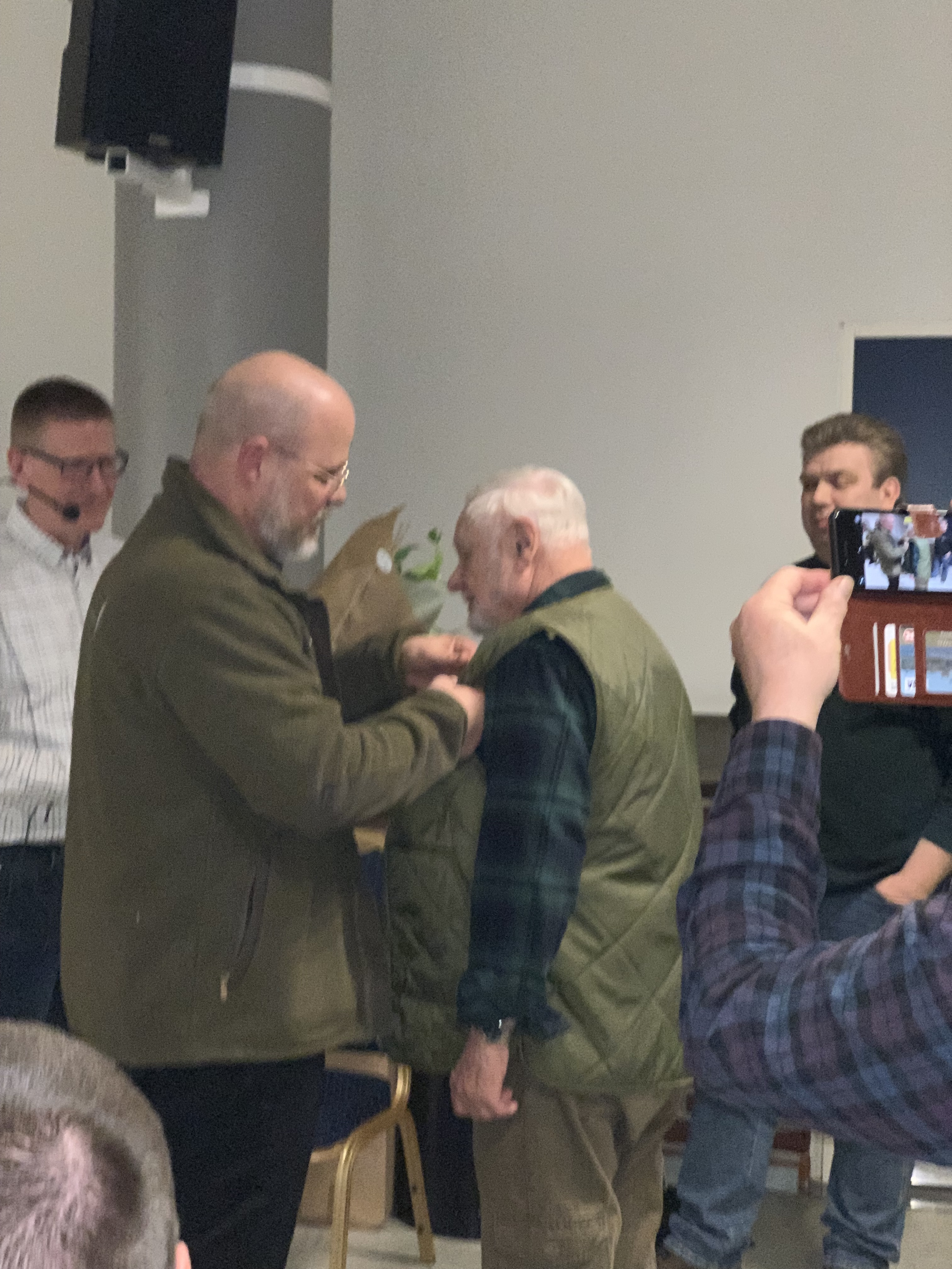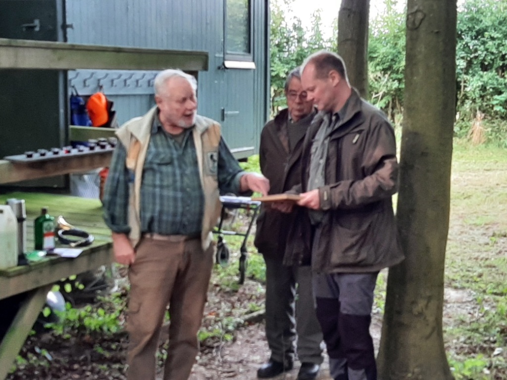 Under dagsordenens pkt. 8, "Indkomne forslag og uddeling af tegn" var der tildeling af 3 aktivitetstegn. Da disse var overrakt, blev vores egen formand kaldt frem og blev - til egen store forundring og forbavselse - tildelt Jægerforbundets bronzenål. Overrækkelsen blev foretaget af HB-medlem, Kreds 3, Torben Schultz Jensen, der oplæste en fin motivering. Efter behørig fotoseance takkede Jørgen for den fine hæder.