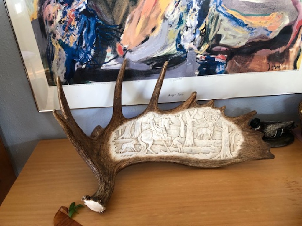 Det blev naturligvis fulgt med øjnene, og da det havde passeret næste skel og dermed igen var inde på vores revir, drejede det pludseligt et par gange rundt om sig selv og faldt. Det viste sig at være en fin gaffelbuk i bast. I skoven blev der yderligere lettet en sneppe, der ikke blev skudt til samt en hare, der efter 2 "salutskud" løb frejdigt videre. Den løb gennem hegnet ind til "firkanten", netop på sted, hvor formanden havde stået 2 min. før, men havde pakket sammen og forladt posten, fordi han blev kaldt på af Koudal, der mente at såten var færdig. - Hvilket den altså alligevel ikke var.