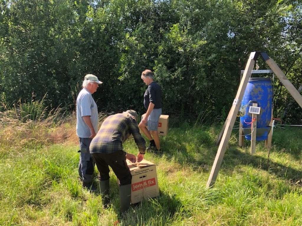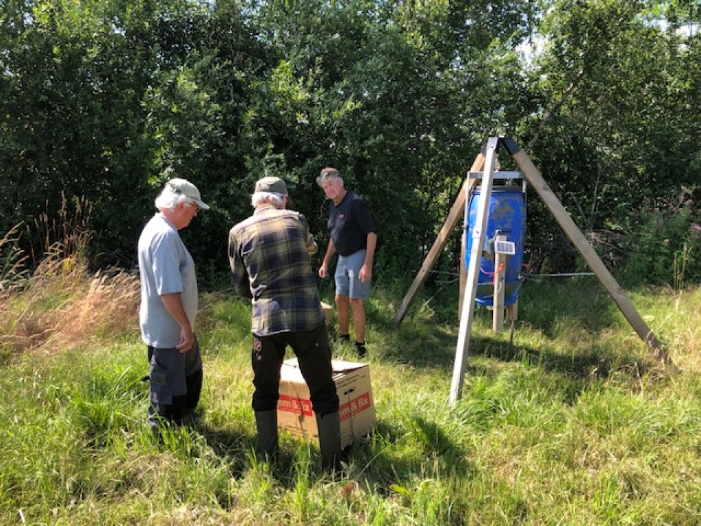 Den automatiske foderautomat er nu færdigsamlet og klar til at blive i9nstalleret i terrænet. - Klik på det enkelte foto herunder for at se det i stor størrelse. Fotos: K.A. Hansen.