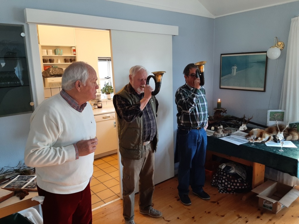 Alle hyggede sig, og snakken gik på kryds og tværs, mens alle nød vejret, udstillingen og de gode lækkerier, inden jagthornsblæserne igen blæste til samling kl. 14.30 og formanden sagde tak for i dag, efterfulgt af jagthornssignalerne "På gensyn" og "Jagt forbi".
